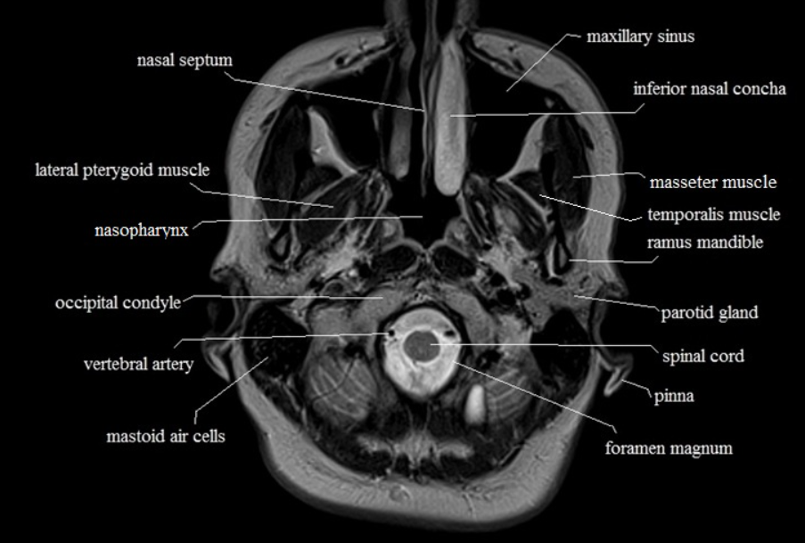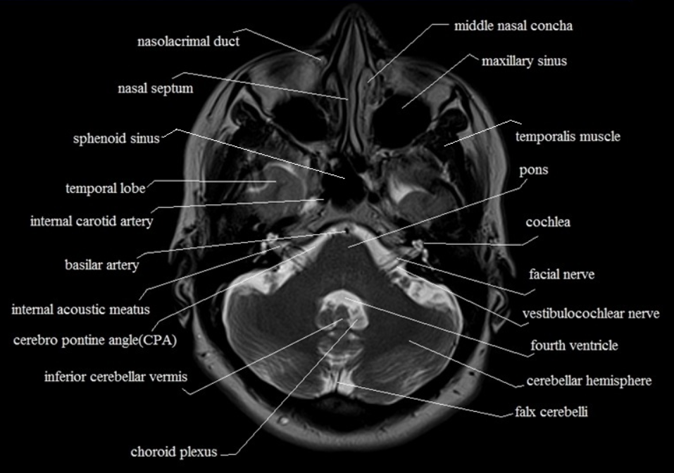 MRI에서 midbrain, pons, medulla를 구분하기가 쉽지 않다. 하나의 선형 구조로 이루어져 있기 때문에 주변에 있는 구조물들의 해부학적 구조를 잘 알아야 MRI에서 병변이 중뇌에 있는지, 교뇌에 있는지, 연수에 있는지 알 수 있기 때문이다.